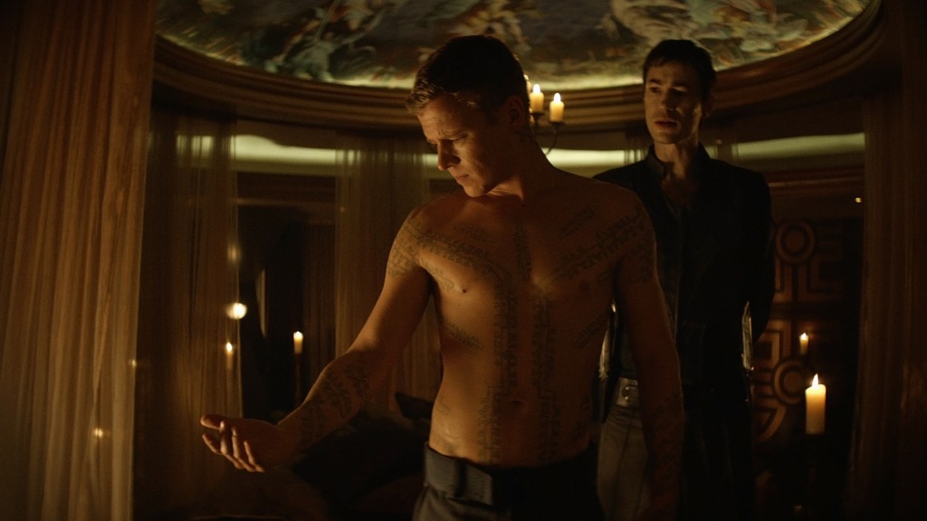 Later that night, Alex and Michael are alone in Michael’s rooms, inspecting the tattoos. The Archangel asks if Alex can read the tattoos, since they are the roadmap to humanity’s survival. Alex tries his best, staring at his forearm, until the tattoos start to move, rearranging themselves into a omnious sentence: BEWARE OF THOSE CLOSEST TO YOU. It affects him so much that when Michael asks again if he can read anything, he responds with “No.”