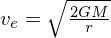 Well now, what about escaping Earth orbit completely and flying off somewhere far, far away? This is called the Escape Velocity. The escape velocity is defined as the initial speed required to propel an object out of the gravitational influence of a larger object and end up infinitely far away with a final speed of zero. Yeah, I know, I’m mixing my words here, but what drops out of the formula that I’m about to show you is a scalar quantity (a number), not a vector. First, let’s make sure we understand a few things. By initial speed, we mean that you fire your engines to get up to that speed and turn them off; we can only carry so much fuel. Second, it is fairly important here that you choose the right direction (vector) to point your rocket. I think it’s pretty obvious that you should not choose to point yourself at the Earth or backward in your orbit. Port or Starboard are also a little silly, let’s just choose the direction of our orbit. The magic formula is: