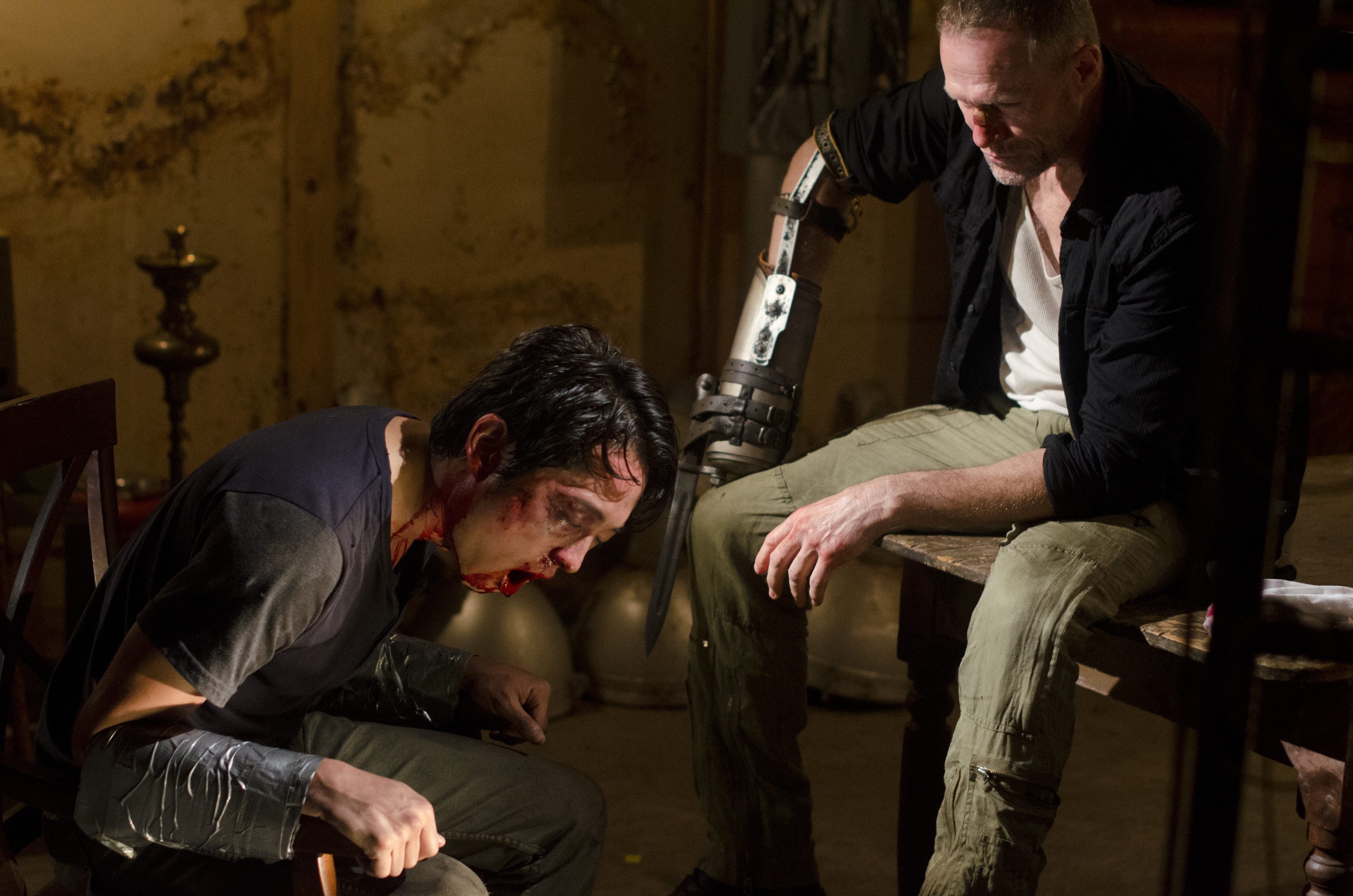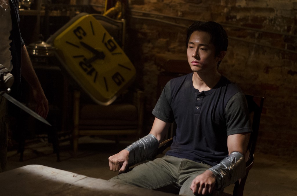 I will indeed. Glenn is in a cell with Merle. Glenn is tied to a chair with duct tape. He is all stoic. Merle asks if Glenn has any idea why he is there. Glenn is still stoic.