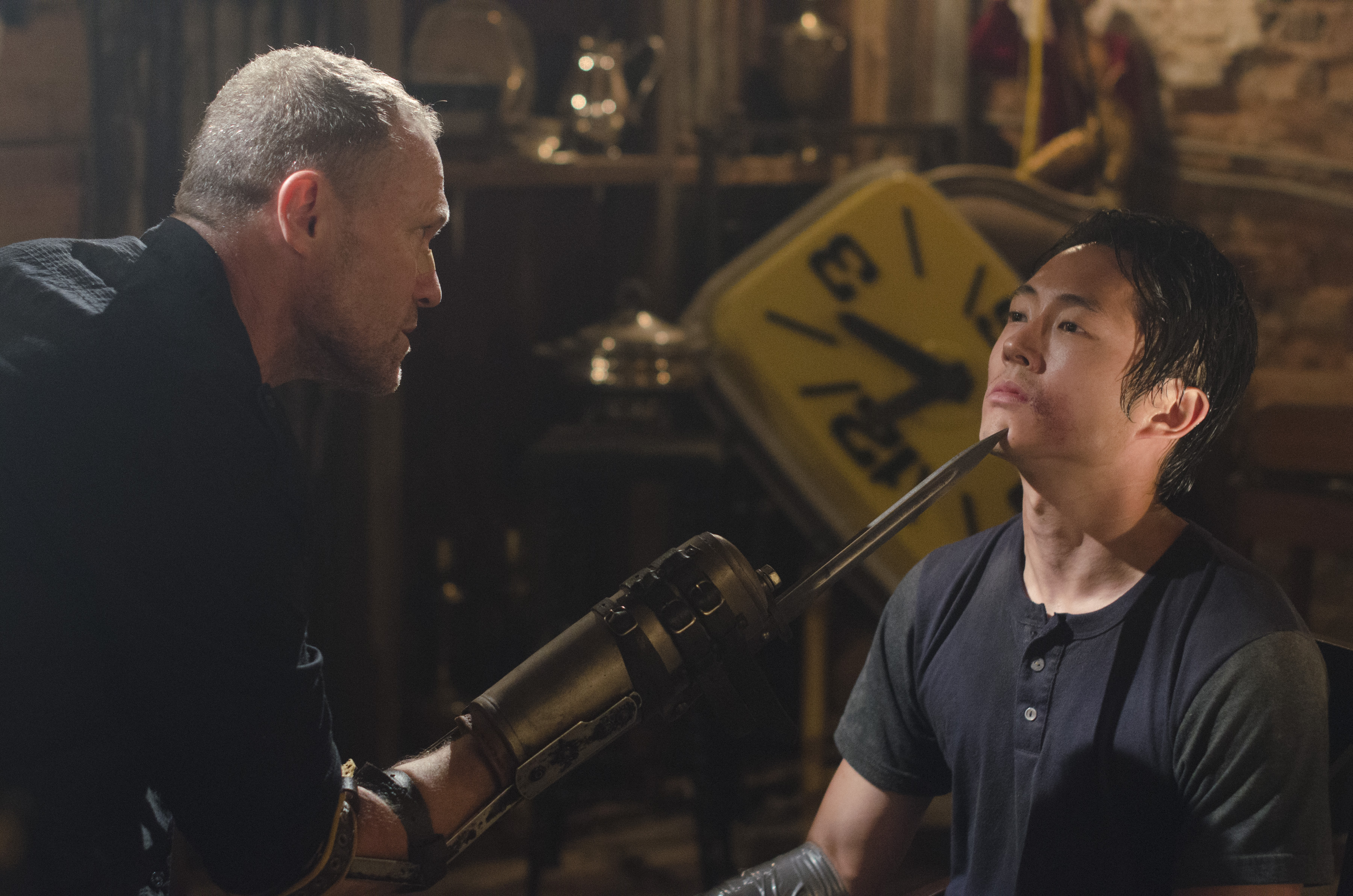He threatens Glenn with the sword arm, putting it under his nose and pressing the flat end into his flesh.