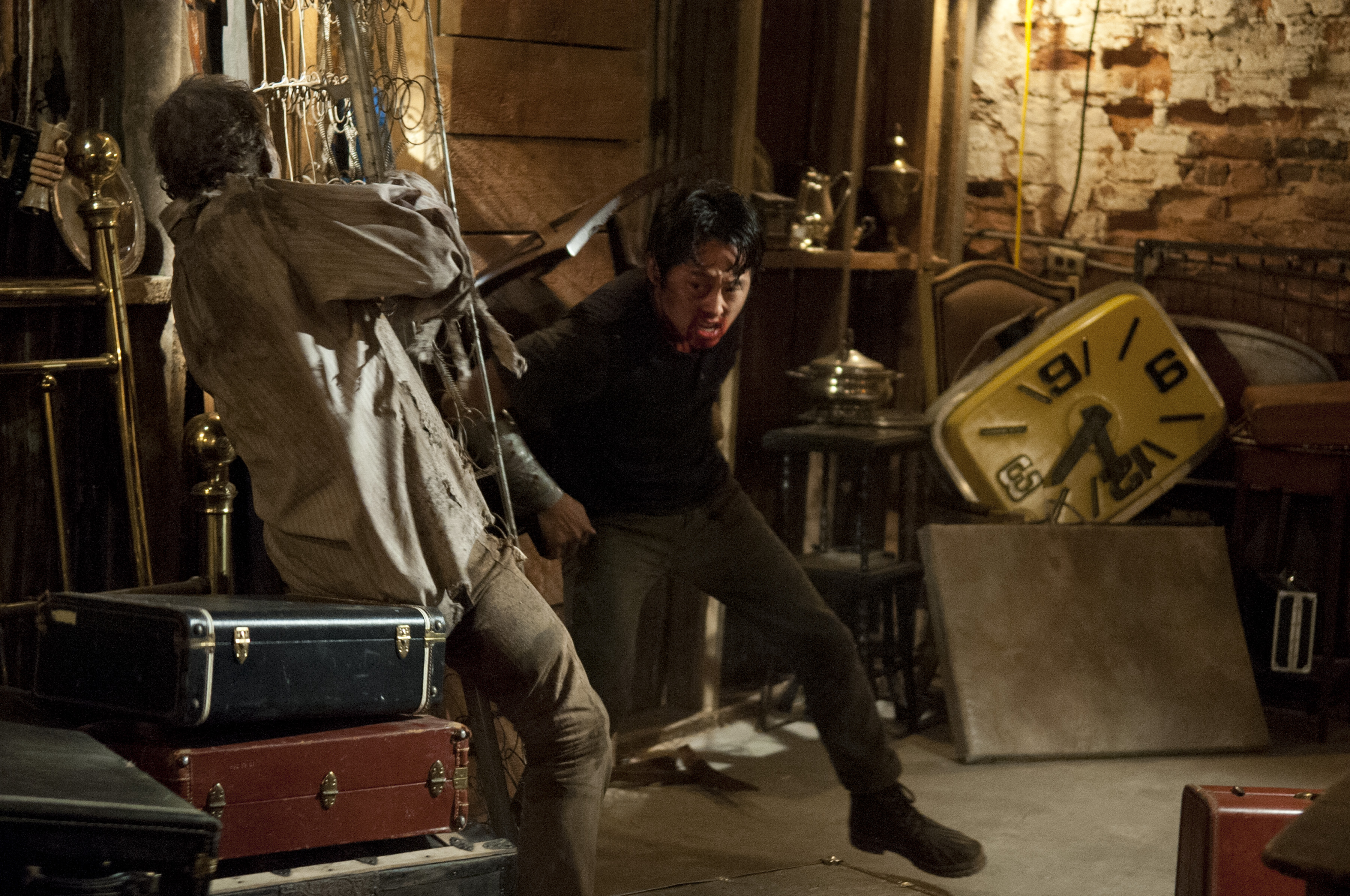 Glenn is using a leg of the chair as bludgeon when The Governor and Merle bring Maggie into the room. The Governor tells them that one of them is going to give up Team Zombie’s position, then he puts the gun to Glenn’s head. Glenn looks like he is ready to die before he gives up the location, but Maggie is not willing to take that chance. She tells The Governor that the rest of the Team is at the prison.