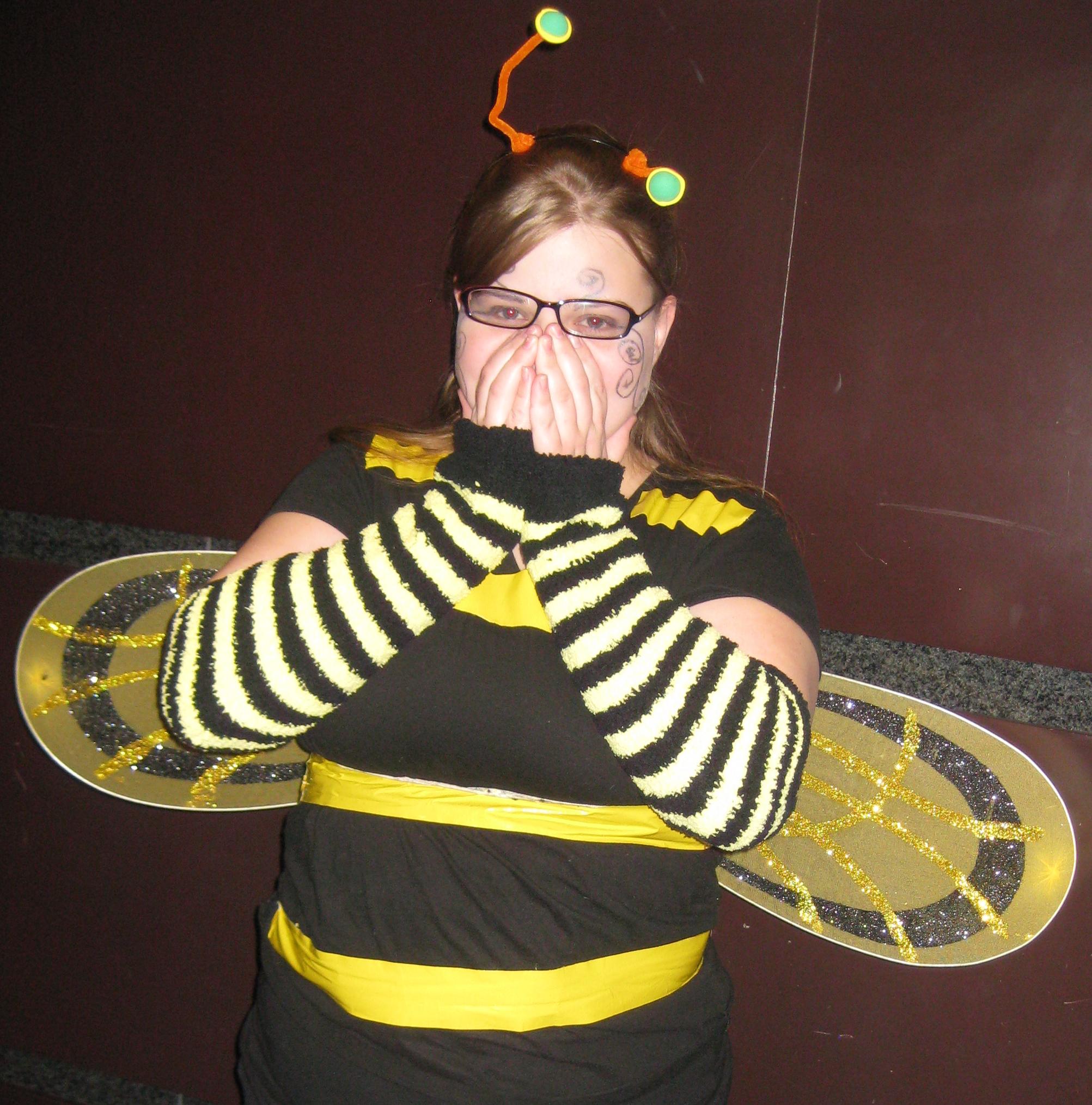 This year was a bit hectic and last-minute on one account, and following a theme chosen by others on another account.  For a Halloween party last Wednesday, I had about 10 minutes to get a costume together due to long driving times…so I went a little nuts and dressed as an alien tourist.  I’m talking cheesy sweatshirt, socks with flip-flops, map, the whole shebang.  I also painted my face purple, retextured it with latex, and added odd contours with shadows.  Very few people recognized me at first and it was a general hit.   Today, however, I’m wearing a totally different costume at work.  Our bosses at HQ decided it’d be fun to have all of our locations decide on a theme and compete against each other.  The location I’m at this week had decided on bees.  We’ve got a spelling bee, a queen bee, and so much more…but, at the request of a few coworkers, I’m a SciFi bee.