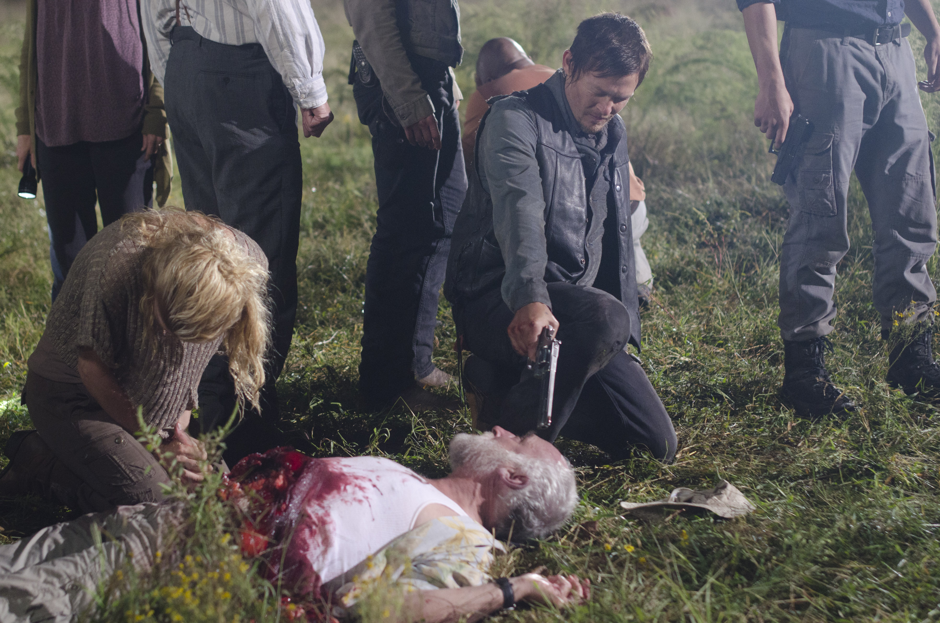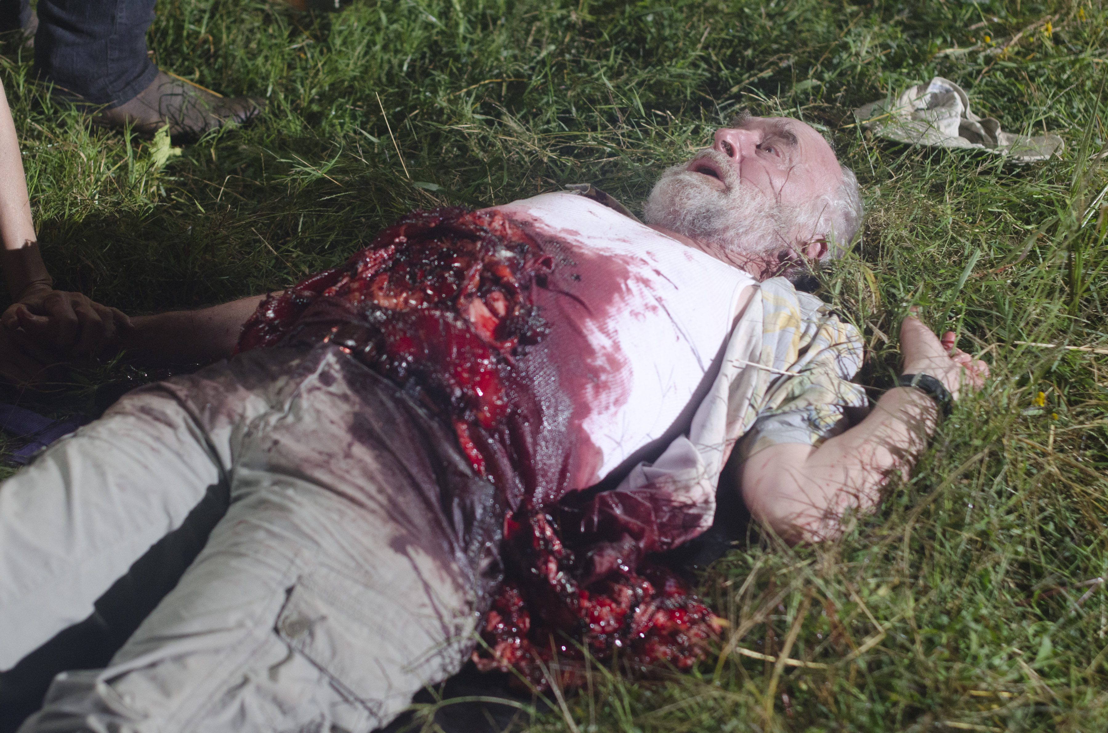 He is losing pretty badly to it, and it basically guts him. Everyone arrives just in time to not be any help at all. Daryl puts a knife in the walker’s head and Hershel arrives and tells them there is nothing that he can do for Dale. Well yeah, his entrails are hanging out.