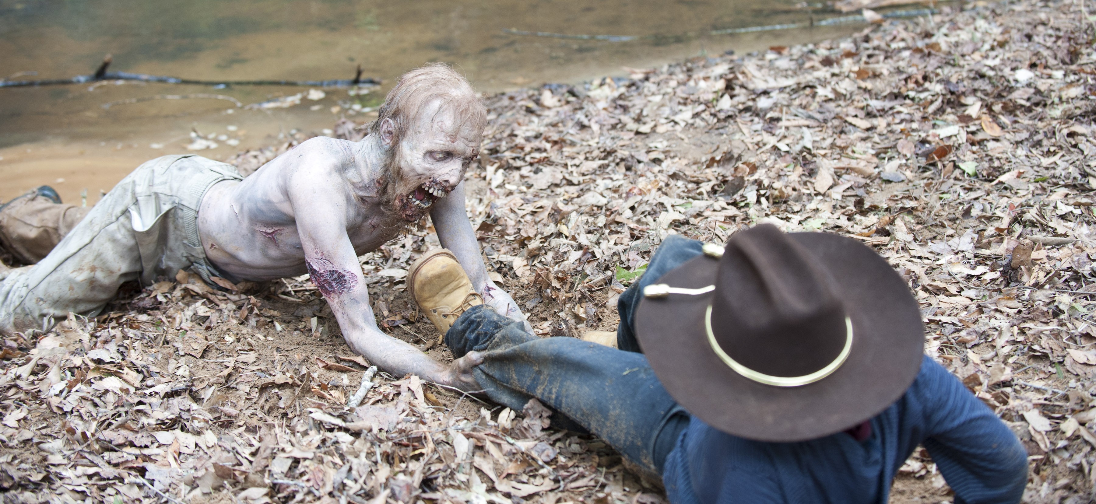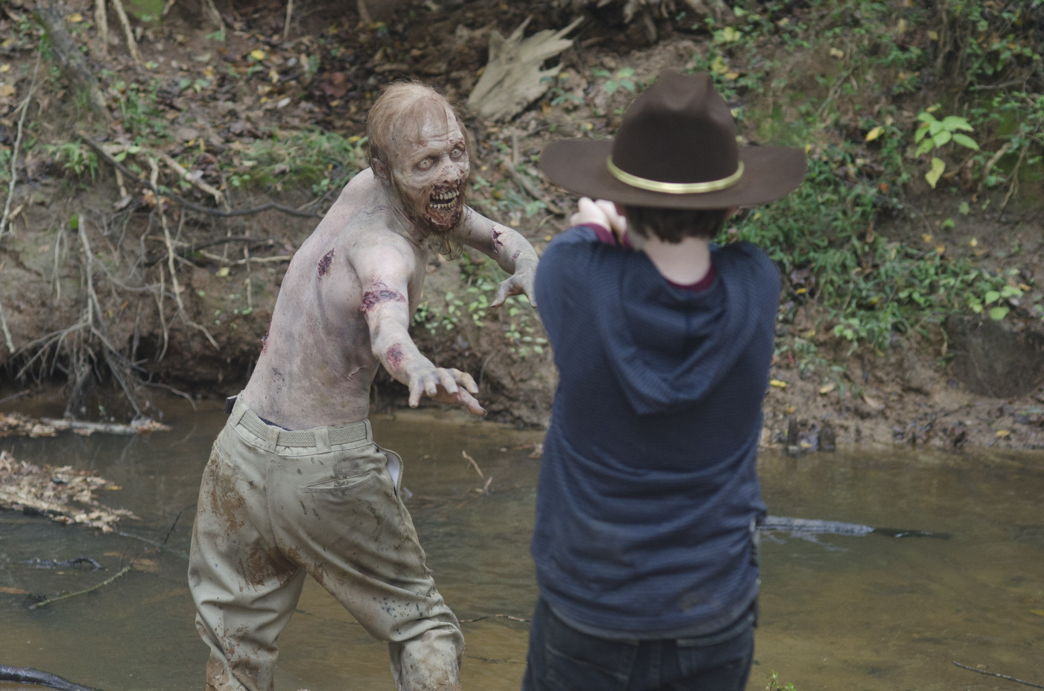 Meanwhile, in the dumbest plot thread ever, Carl is still toying with a dead thing. He points the gun at it, but the walker gets its feet unstuck from the mud before he can pull the trigger. It falls on Carl and knocks the gun from Carl’s hand. It tries to get a hold on Carl, but Carl is able to get away.