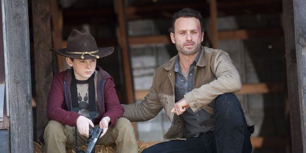 Rick walks around while the others fortify the house. He finds Carl in the barn and they talk for literally forever. Rick offers Carl the gun. Rick says that Carl did not cause Dale’s death and that the kids stuff is over, and Carl needs to man up and take the gun. Rick unloads the entirety of mortality on Carl’s little 10-year-old shoulders. Literally forever. Rick monologues about his father and how he’s tired and Carl needs to have the damn gun. So Carl takes it.