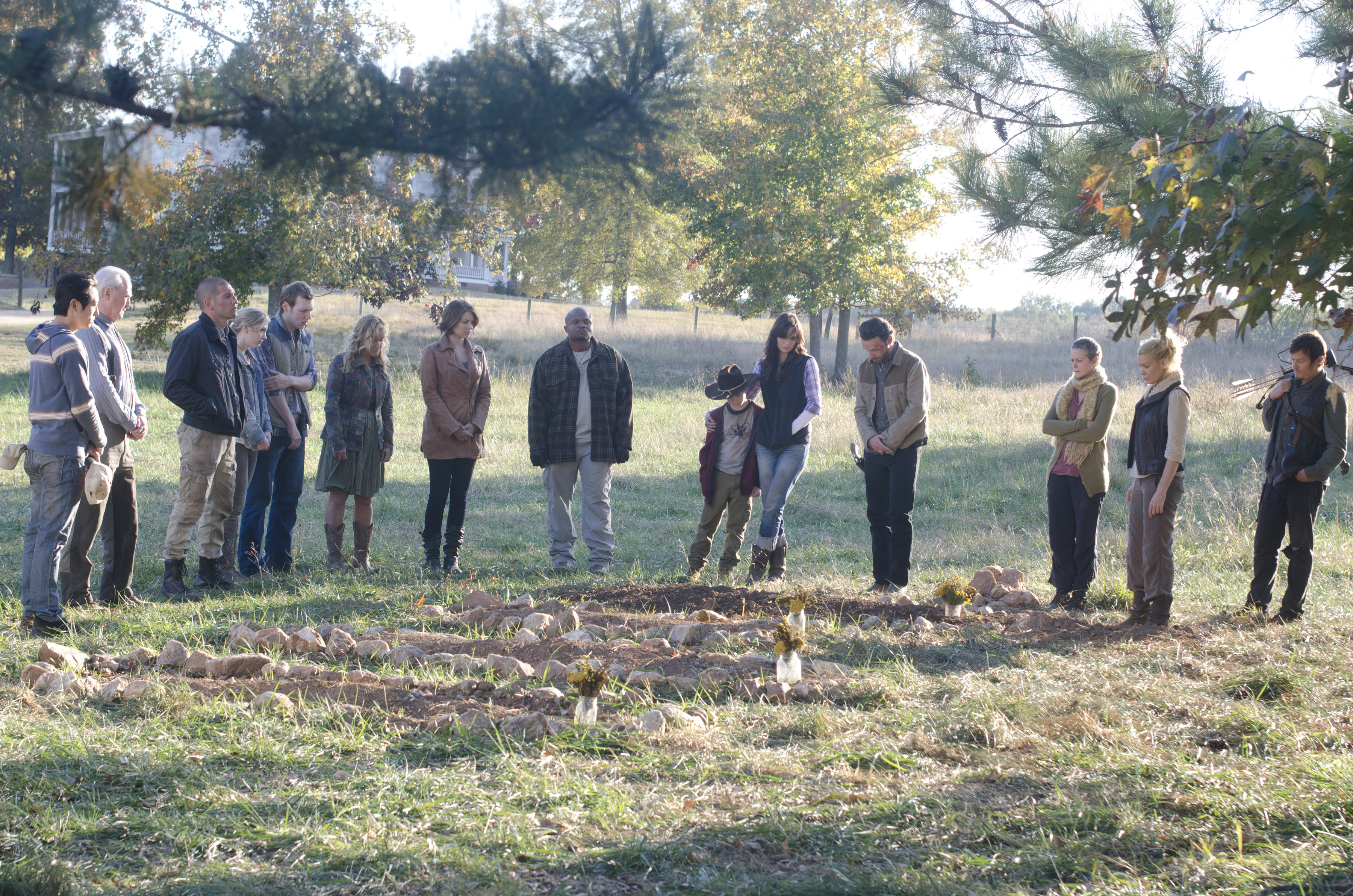 The truck is driving down the dirt road with Andrea, Shane, Daryl, and Theodore in it. While Rick is eulogizing Dale at the little funeral. That cemetery is getting a little… large.