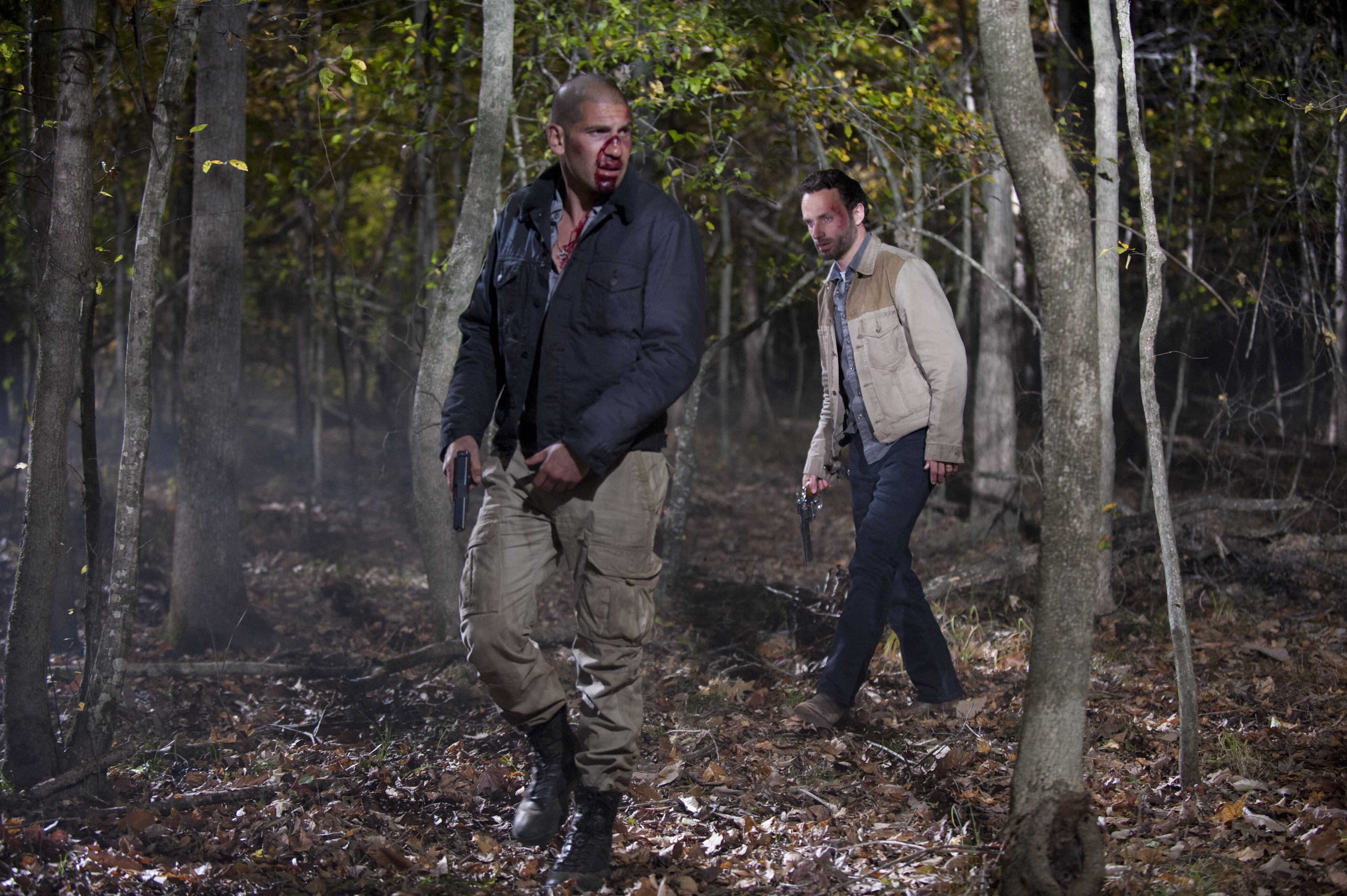 Rick and Shane reach a clearing and Rick is in the lead. Rick is still questioning him. Shane says Randall slipped through the rafters, but we all know Daryl repaired the hole earlier.