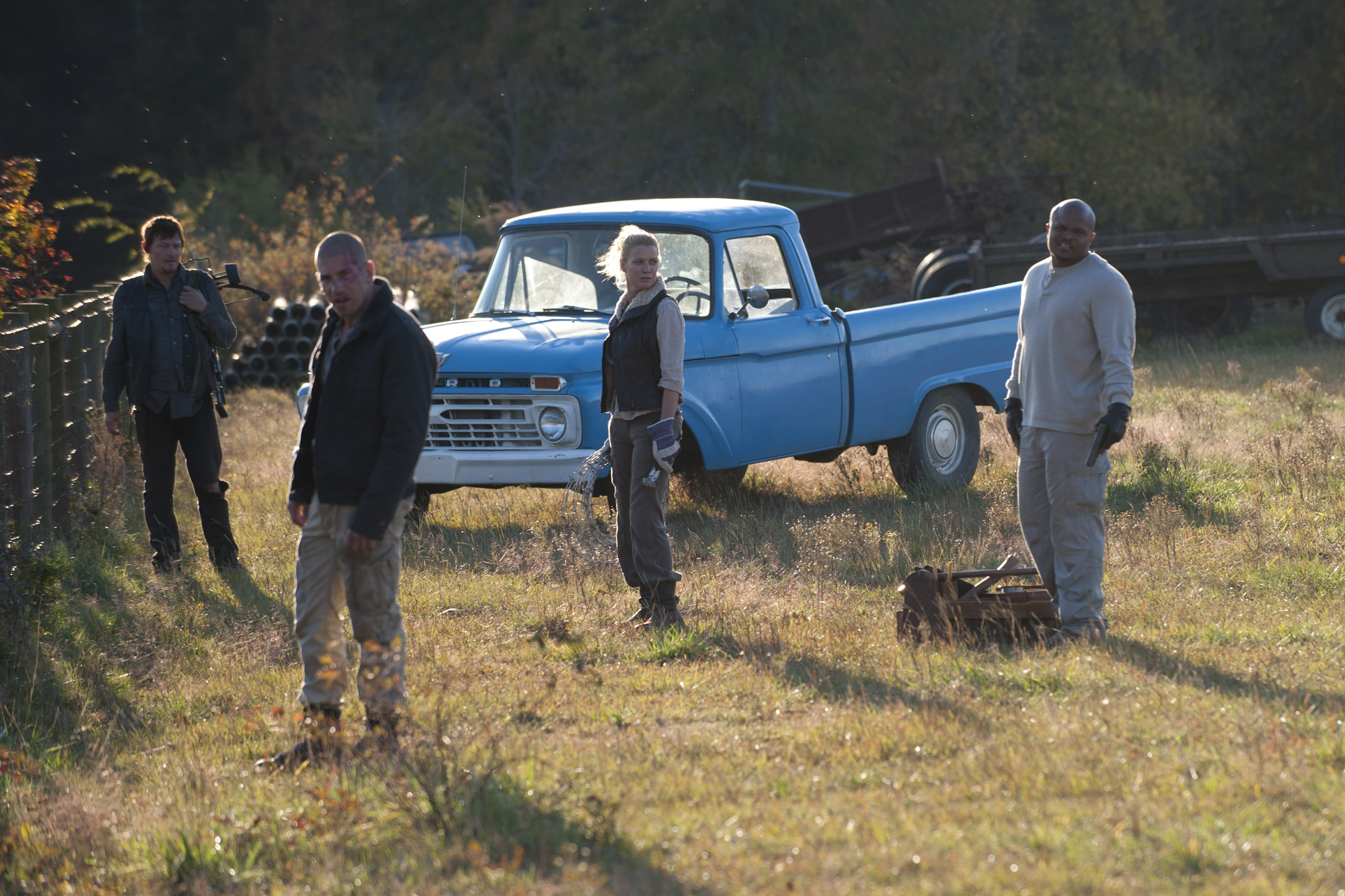 In a nearby field, Daryl leads the hunting party around to re-kill walkers.