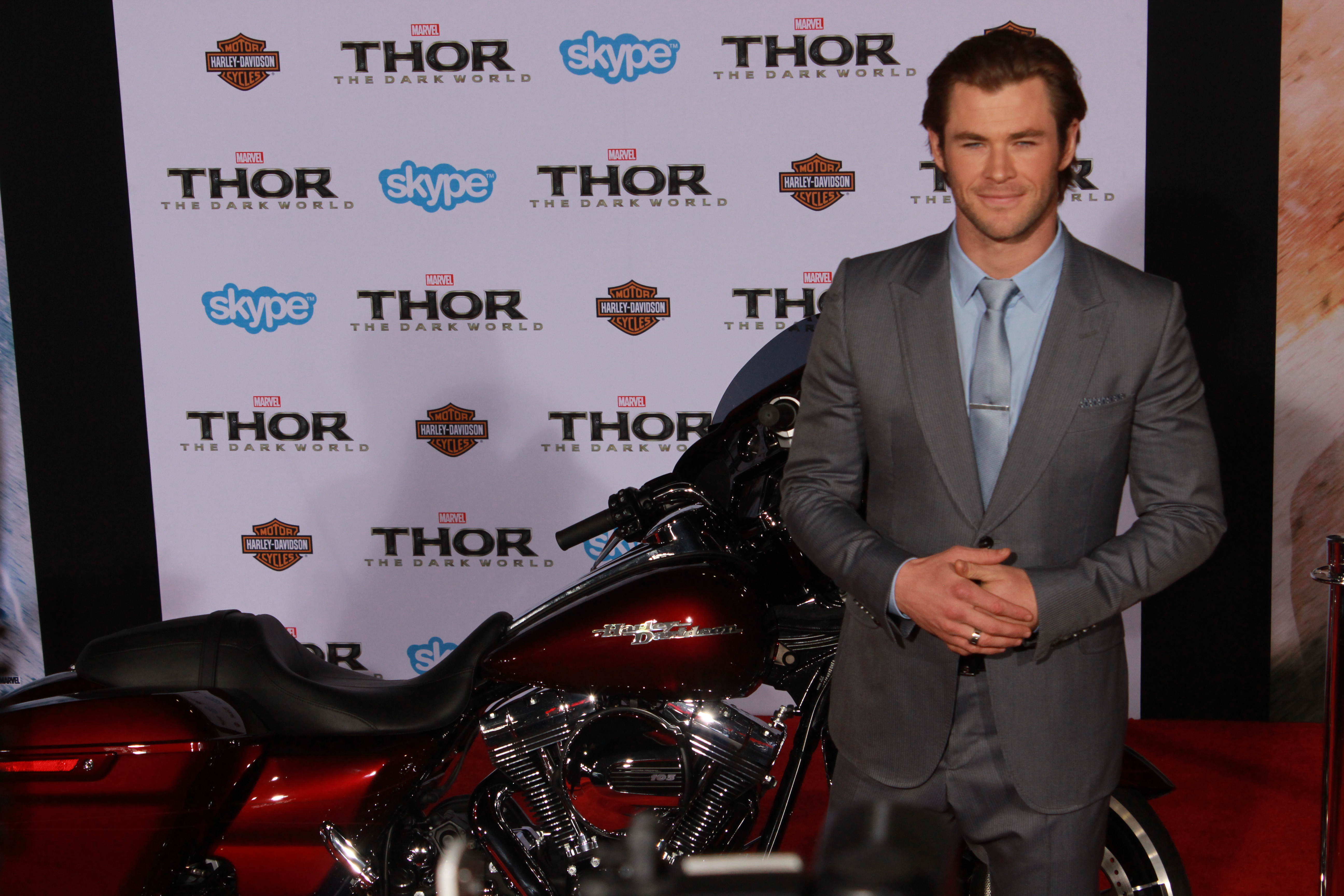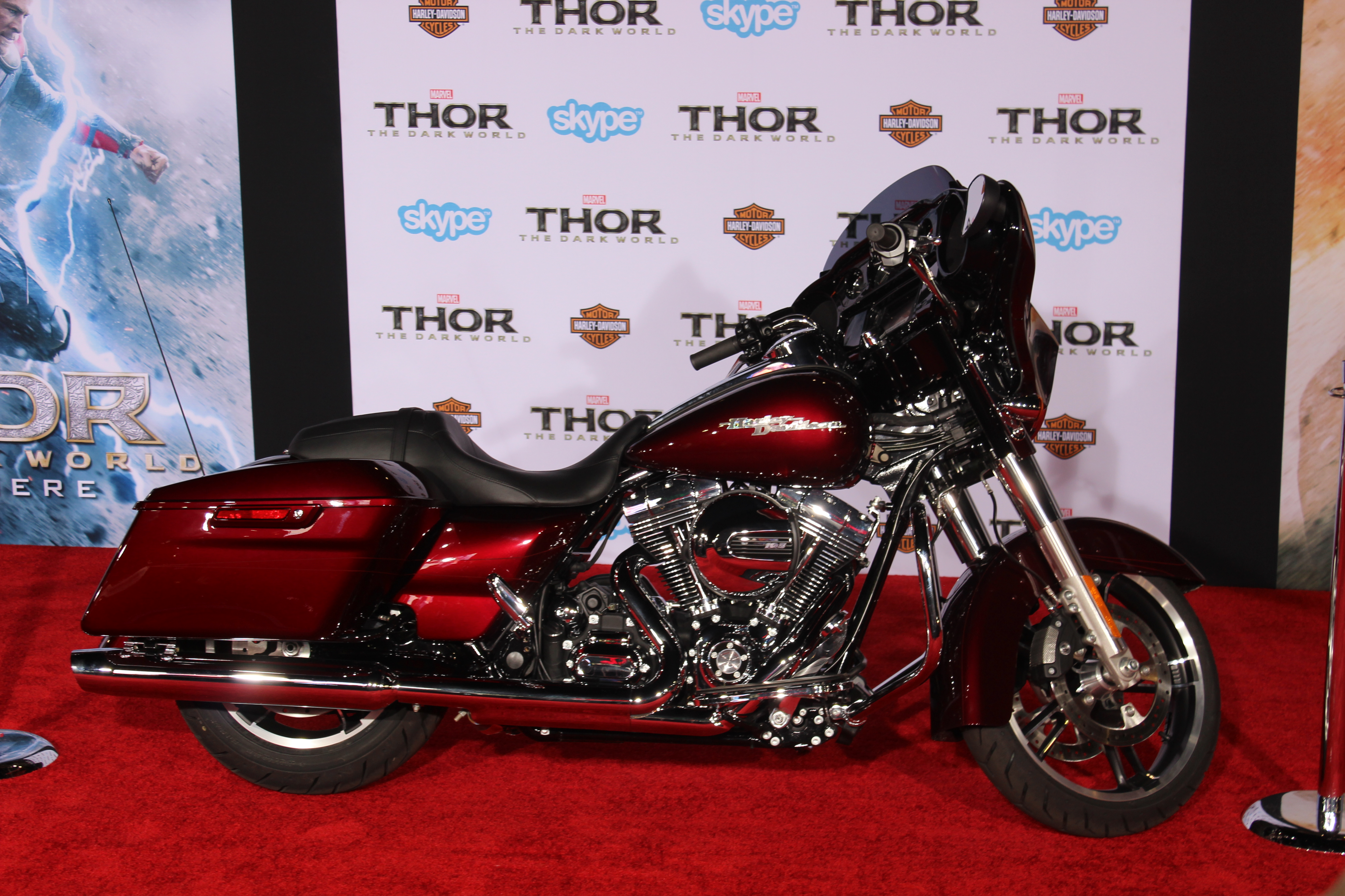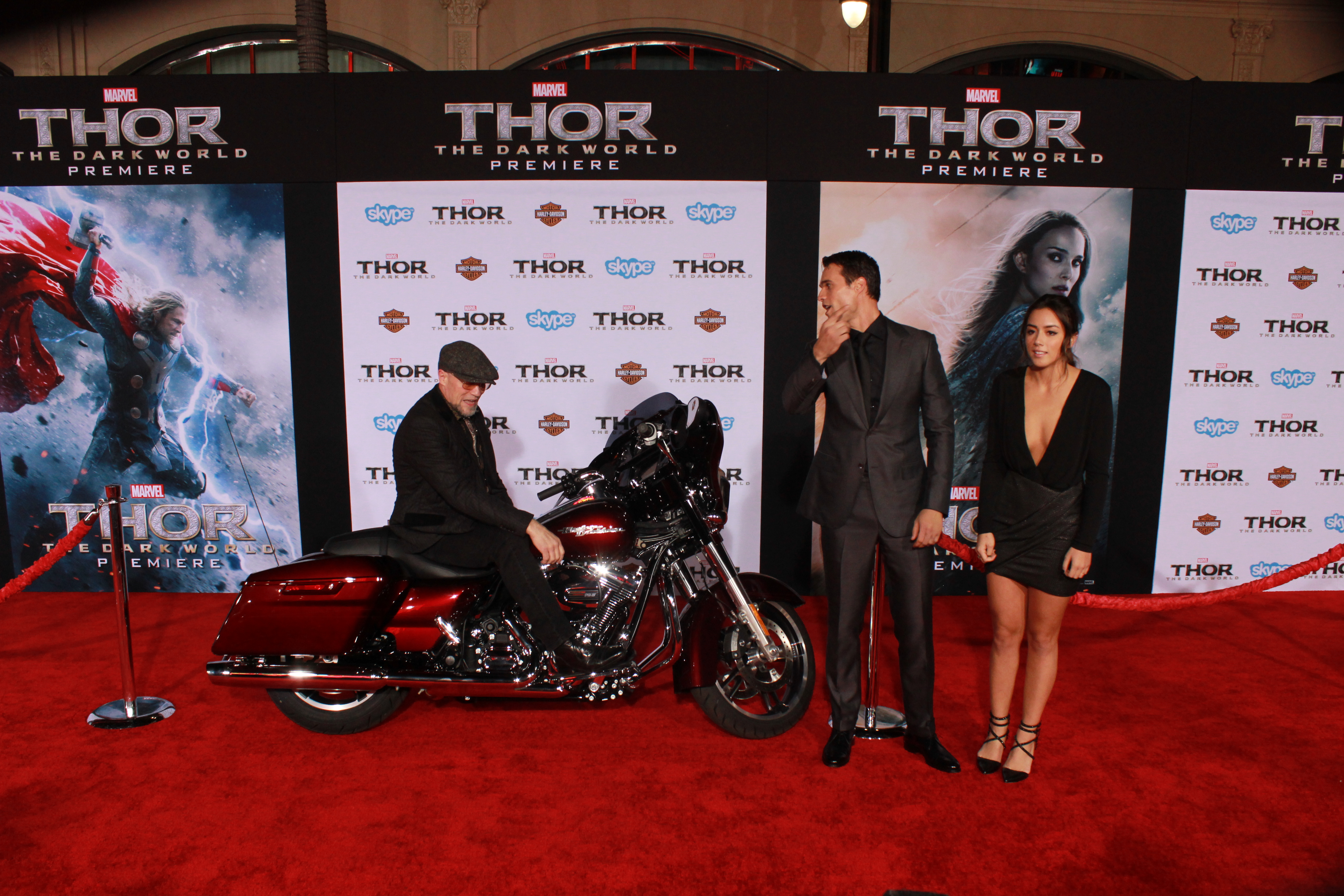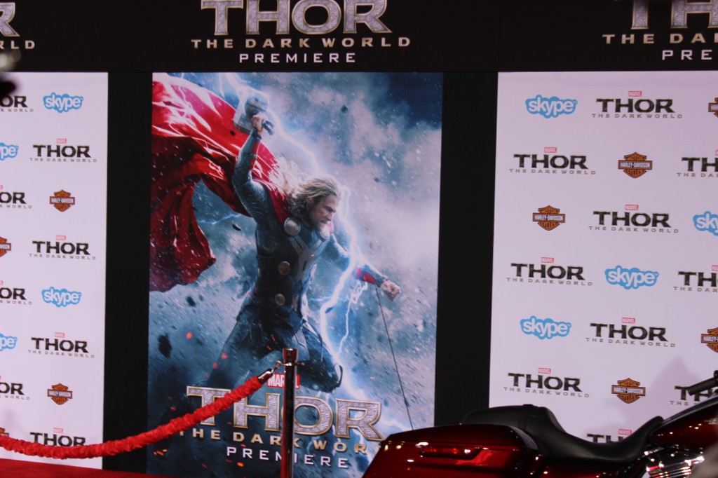 At the famed El Capitan Theatre, “Thor”, (aka Chris Hemsworth), brought the THUNDER when he came out for the World Premiere of Thor: The Dark World. And there was an awesome Harley Davidson bike throughout the event.