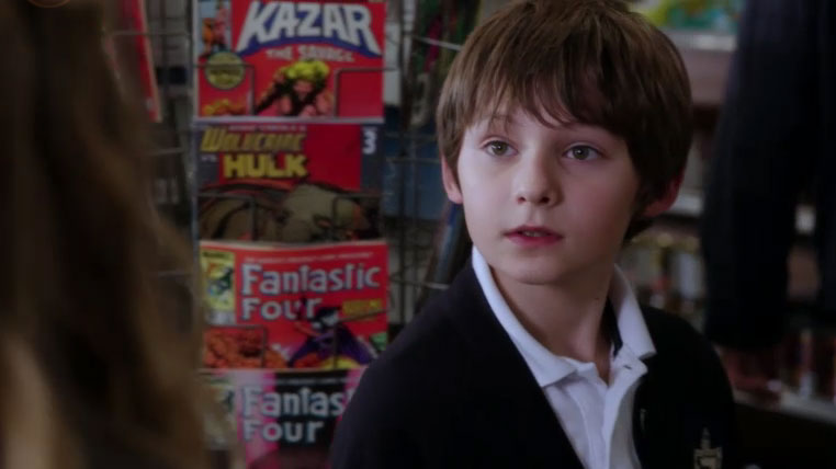 So, Henry is in the drug store getting his dose of Disney corporate cross-promotion: reading Marvel’s Hulk vs. Wolverine (got to get that product placement in!) when he turns around and almost bumps into Eva. This is one of those meet-cutes you hear about. Geek kid meets pretty girl over a comic book. You can even see it in Henry’s face – “This girl is talking to me?” It has all the earmarks of the classic “how I met your mother” story – including her brother Nicholas putting stolen goods in Henry’s backpack. Busted by Sneezy!
