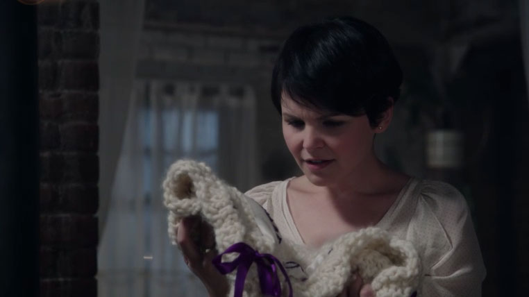 In the aftermath, Emma and Mary Margaret talk about finding Emma’s parents. MM is sure there’s a reason why they haven’t been easy to find. Emma finally tells her Henry’s theory, that she’s the daughter of Snow White. Now, this is where Mary Margaret could react in one of several ways, but she takes it in stride: “Well, you do sort of have my chin.” She takes it a lot better than I would have expected. But when Emma goes out for air, Mary Margaret spots the baby blanket; a bit of almost-recognition there. I expected her to flash, like Graham did. But not this week.