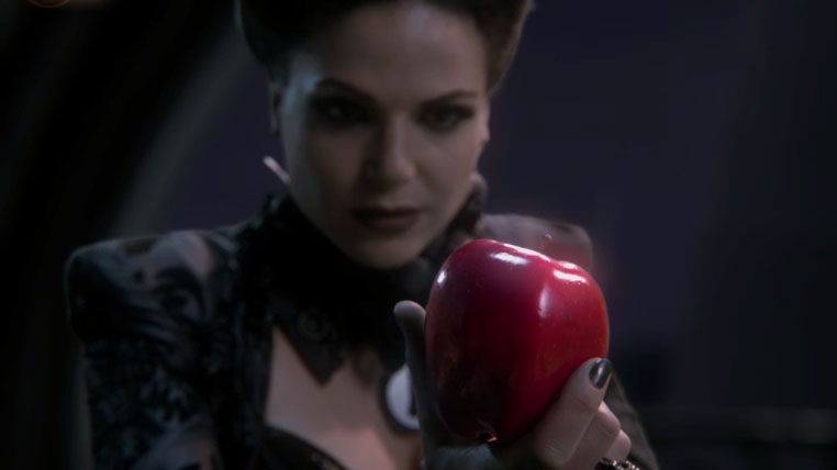 The kids bring the satchel to Grimhilde, who reaches in and pulls out an apple. Hansel, of course, gets mouthy about going through all of that for just an apple. Grimhilde, naturally, has an answer. This is no ordinary apple. Oh, no. It’s a weapon for a particular and devious enemy – obviously she’s talking about that hag Snow White. And we all know what she plans to do with that apple.