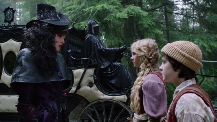 The sob story continues in Fairy Tale Land, where Hansel and Gretel are just looking for their father, and Gretel uses Hansel’s sling to knock over a guard David vs. Goliath style, and they run. Only to be cut off at the pass by Smoke-Monster-Effect Grimhilde, who’s sporting a cool hat and long black tresses (except the wife didn’t care too much for the leather pants…). The Evil Queen makes a deal with the kids: she’ll let them go if they do something for her first.