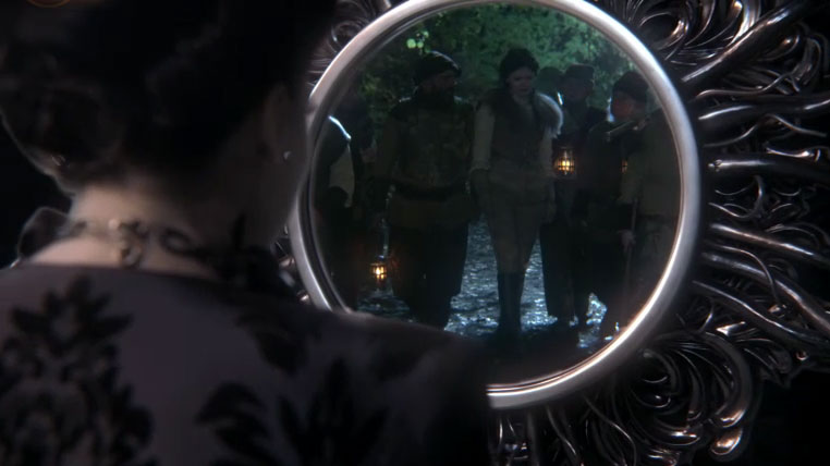 FTL: Evil Queen is looking into the Mirror watching Snow White; she’s cavorting with dwarves now. This is apparently after Snow’s encounter with the prince, but before the Evil Queen disguises herself and delivers the apple. The guards bring in Hansel & Gretel’s father for interrogation. Why is it, that the children refused her offer of riches and chose to search for the father instead. Dad has an easy answer: “Because we’re family. and family always finds each other.”